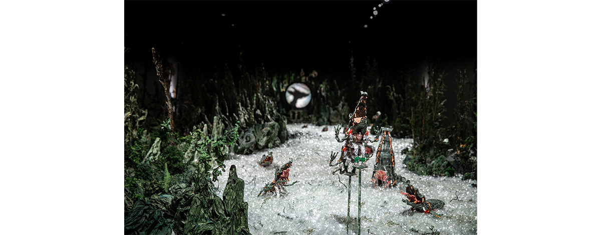 張徐展的《複眼叢林》個展以純熟的紙偶停格動畫和紙紮雕塑裝置,打造奇幻鮮活的動物扮裝演員,構築原始怪誕的荒野鏡像。張徐展善用紙質的紋理、韌性、皺摺、色澤,塑造情感飽滿的視觸景觀,建構陰森懸疑的劇場美學。在製作執行方面,細緻統合了文學、音樂、美術、藝陣、京劇和攝影各專長領域,拓展動畫和裝置藝術的框架。整體作品的題旨觀照萬物的生存挑戰,直指肉身變形和靈魂重生的渴望,跨越文化和語言的隔閡,交織出獨特的生命哲學。(主筆/曾少千)