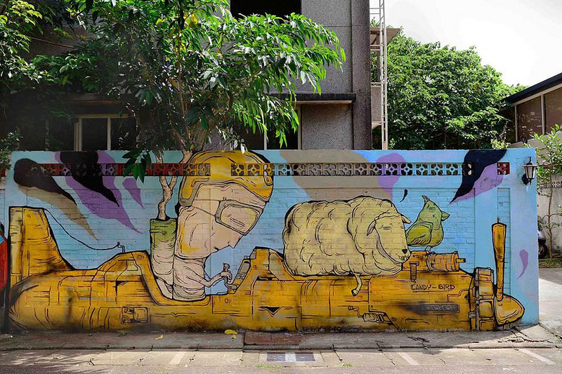 The entire city is his art studio. In different streets in Taiwan, one often encounters his works, greeting passersby from dilapidated corners or surfacing as the shadow of a storyteller, who briefly yet bluntly exposes the injustice of the civilized world. As his travels take him to different places, he has carried bottled cement paint in his suitcase and brought his works to Berlin, Myanmar, and Beijing. He has often said, “everything can be painted,” which states the most prominent features in relation to the viewing space of graffiti. He likes to treat himself a carbonated drink and enjoys the pleasantness triggered by food coloring and sugar on the tongue. He is the graffiti artist, Candy Bird.