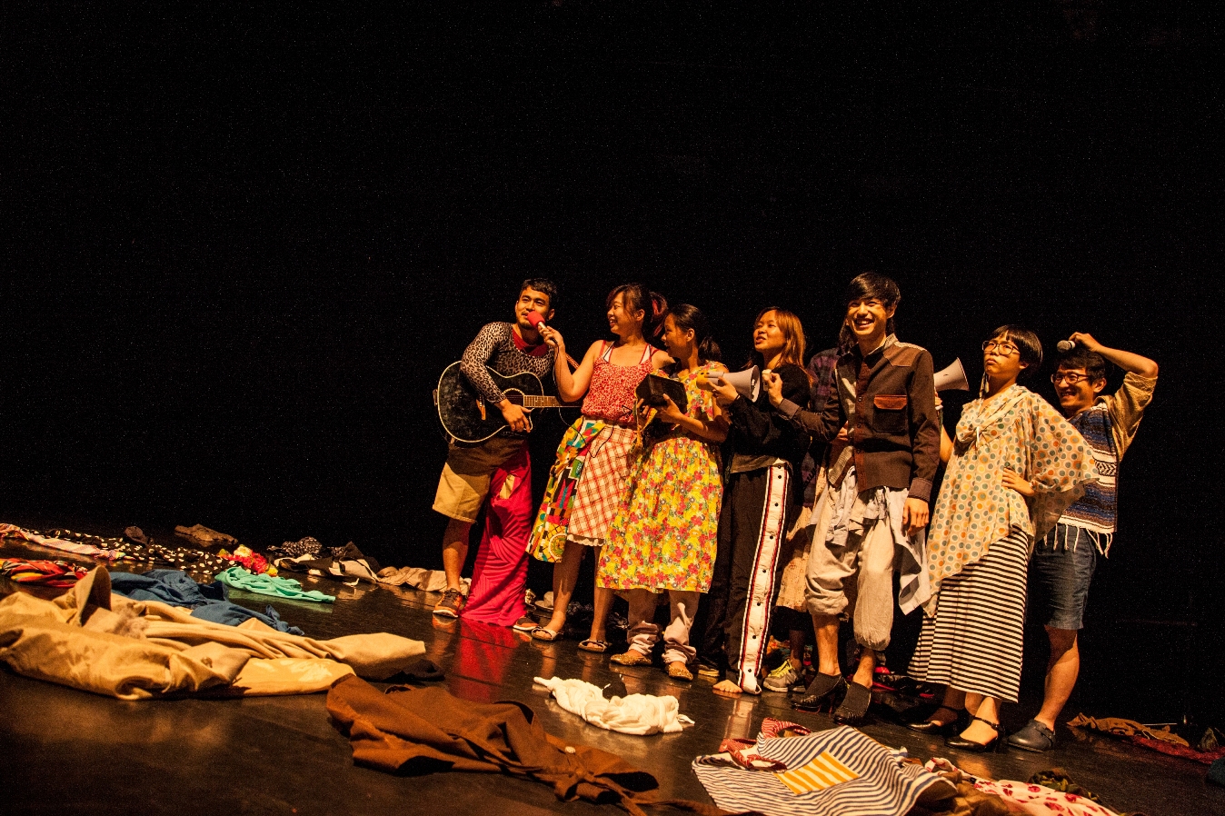 “When we sing in the KTVs, we can’t deny that it is me who is singing although there is not a thread of my emotion in the voice.” Singing other people’s songs and repeating other people’s words is similar to the conditions such as “the loss of speech” or “unable to sing one’s own songs.” This is a very generic and common concept. Love Song 2010 amplified this usual experience and turned it into the performers’ sense of time and body on the stage while treating voices as a formality. Without the structuring of a storyline and dialogues, the actors in this play abandoned the burdens of playing fixed roles. It allowed nameless characters to sing other people’s songs and repeat in turns all kinds of formulaic phrases, advertisements, and speeches. Through this approach, the audience could re-experience “listening to a play”: a means to have the “plots propelled by listening” instead of “having the songs for the plot’s sake.” The actors’ bodies became the agents of all types of speeches and songs; no matter they were speaking or singing, the actors could not depart from this body encoded by voices, music and the speech system. Also renouncing lines and narration that have usually restrained actors in theater, Love Song 2010 transmuted the expressive techniques related to subjective expression such as speaking and singing into the theme of the work. As a matter of fact, what the play contemplated on was how to narrate when there were no “romance” and subject but only songs and speeches. (Commentator / GUO Jau-Lan)