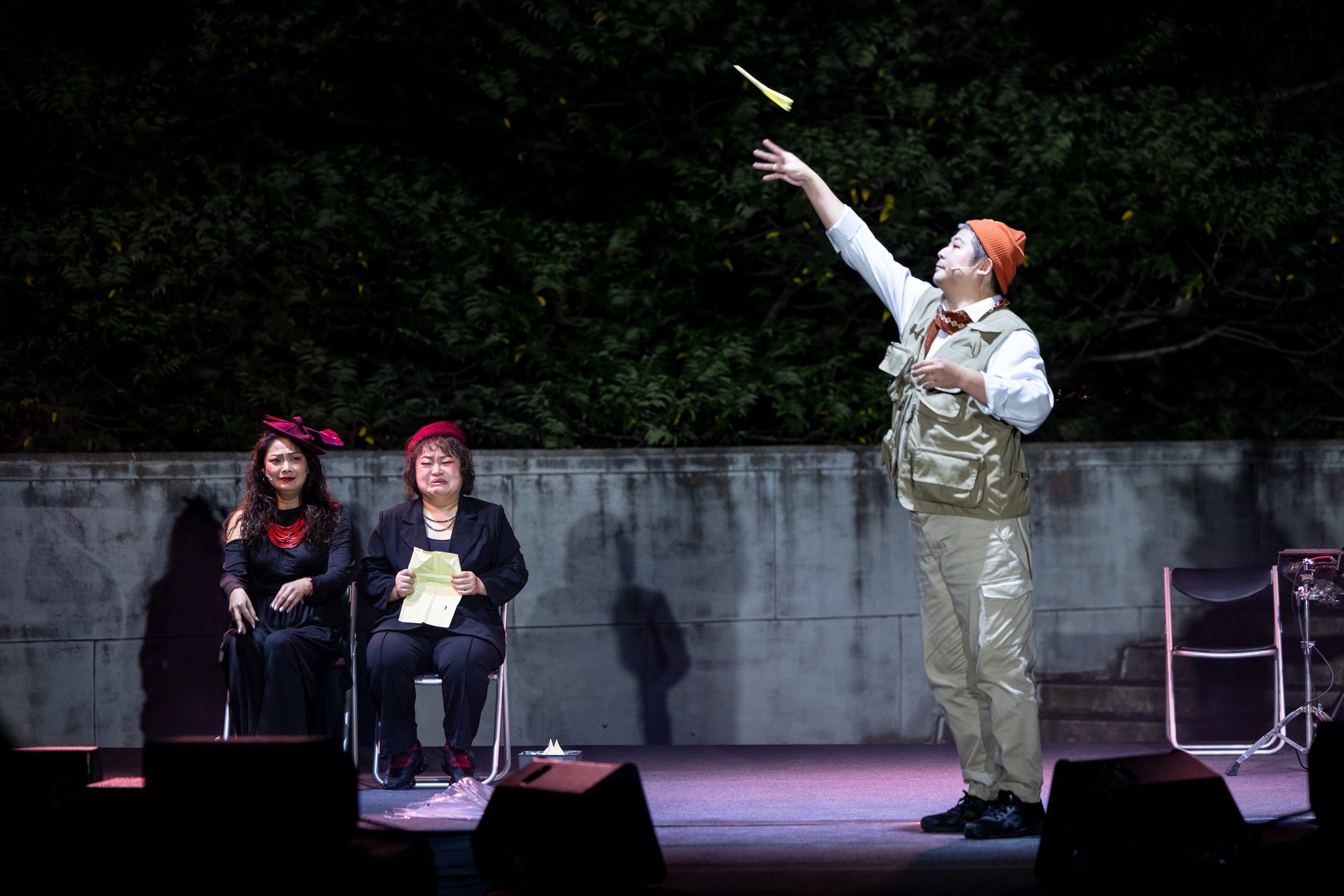 《如如在耳》表演場地是在昨日世界長城廣場,需要辛苦的爬坡才能抵達,沿途有許多有趣的作品,當天有點飄雨,草地也有些潮濕,似乎不減大家對藝術活動的熱忱,不少演出作品都有人排隊或預約觀賞,就算是拍照有時候也需要等一會兒呢。《如如在耳》一開始透過表演者撐傘及台詞,我有猜出是尚未出生的動物視角,直到表演者將傘往旁邊一丟破殼而出才知道是鳥類,其中一段透過廣播電台方式講述許多動物在人類環境的處境,到後來坐在舞台最前方的樓梯將動物們的來信摺成飛機往觀眾席射出,一開始覺得這項互動安排挺有趣的,因為許多觀眾會想在不影響其他人觀賞的情況去接住紙飛機,漸漸地我有種射飛機像是動物們想向人類傾訴的感覺,無奈可能語言不通,也可能是沒機會了,只能祈求能不能有人類發現牠們的心聲,演出過程中鳥類們同時望向飛機,是不是也代表著人類每一項活動也正影響著牠們的生活,如果說丟失寵物讓人如此心痛,難以割捨多年,若動物們丟失自己的家園,甚至與家人分離,相信這份傷痛也是很難淡忘。