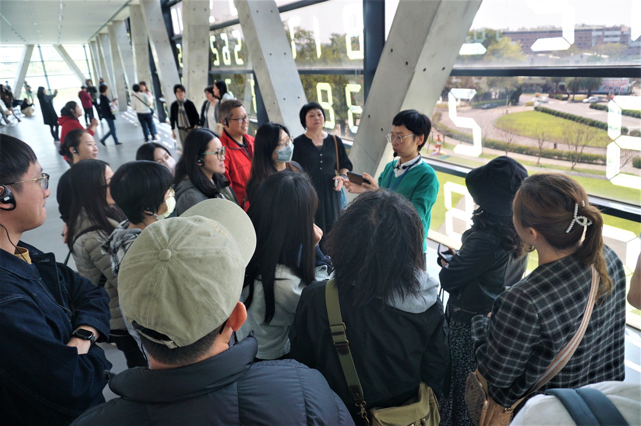 而後參訪的臺中綠美圖,則從建築與城市尺度出發,展現另一種融合的美學。綠美圖為臺灣首座美術館與圖書館共構的文化場域,由SANAA建築團隊(妹島和世與西澤立衛)設計。建築強調「流動」與「透明」,讓自然光與公園綠意滲透室內空間。其設計理念不僅在於形式的輕盈與純粹,更著重於人、空間與環境之間的互動關係。漫步其中,可以感受到閱讀、藝術與自然並非彼此分隔,而是在同一個開放場域中交織發生。這種「融合空間」的概念,也讓我反思組織運作的可能性——不同部門、不同專業是否也能像這座建築般,透過更開放與透明的設計,創造更多交流與創新?
